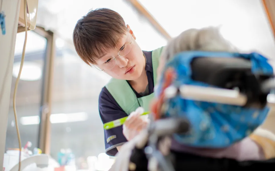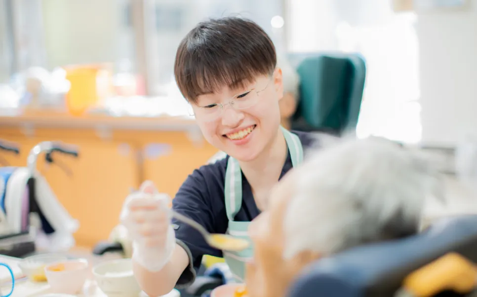 私は、特養での入所者の方々の生活、日常を「いかに楽しく過ごしていただけるか」という思いで仕事をしています。歌がお好きな方、お話がお好きな方、逆に好まない方など、それぞれの個性を意識しながら業務に取り組んでいます。